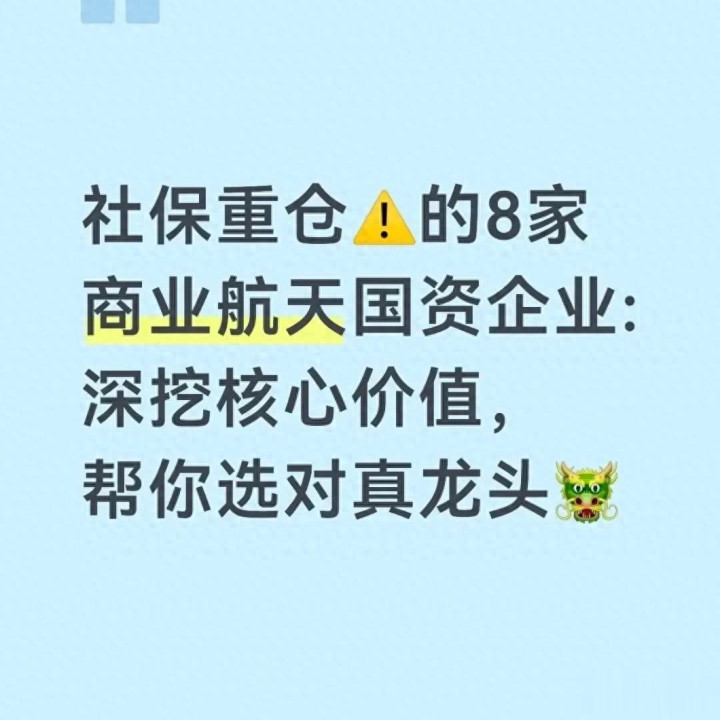 2026年社保基金的持仓动向释放出重要信号:作为追求长期稳健收益的“聪明资金”,社保基金在2025年四季度加仓了8家商业航天国资企业,持仓总市值达72亿元,同比增长65%,这一动作让这些国资企业成了市场关注的焦点。要知道,社保基金选股向来以“业绩确定性、行业壁垒、政策契合度”为核心标准,绝不会跟风炒作纯概念标的。这8家商业航天国资企业能被社保重仓,核心是在商业航天产业链的关键环节占据垄断性优势,且业绩具备持续兑现的能力。今天就用大白话跟大家说透,社保为啥重仓这8家企业,它们的核心价值在哪,以及普通投资者该怎么把握其中的机会。